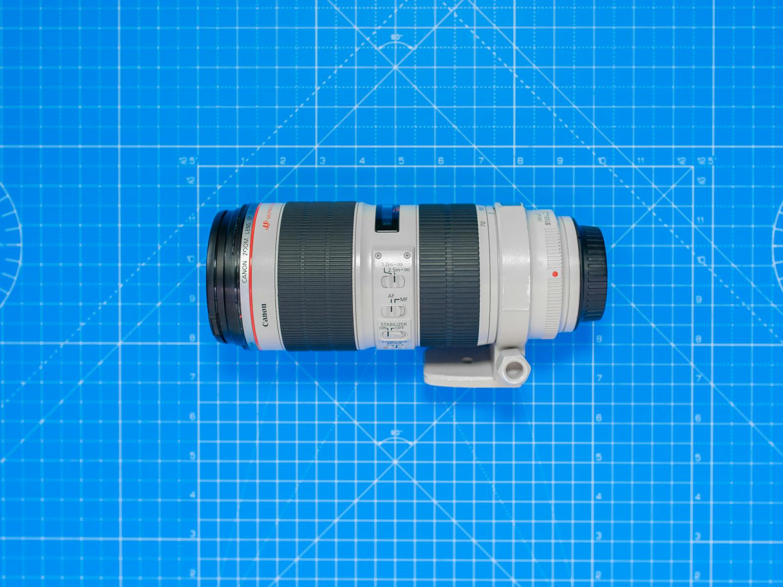 Top view of a professional camera zoom lens on a blue grid pattern background.Example: A 70-200mm zoom lens is a workhorse for event photographers covering sports or concerts.