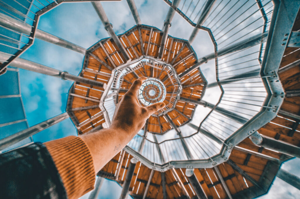 A hand trying to hold spiral staircase from down below